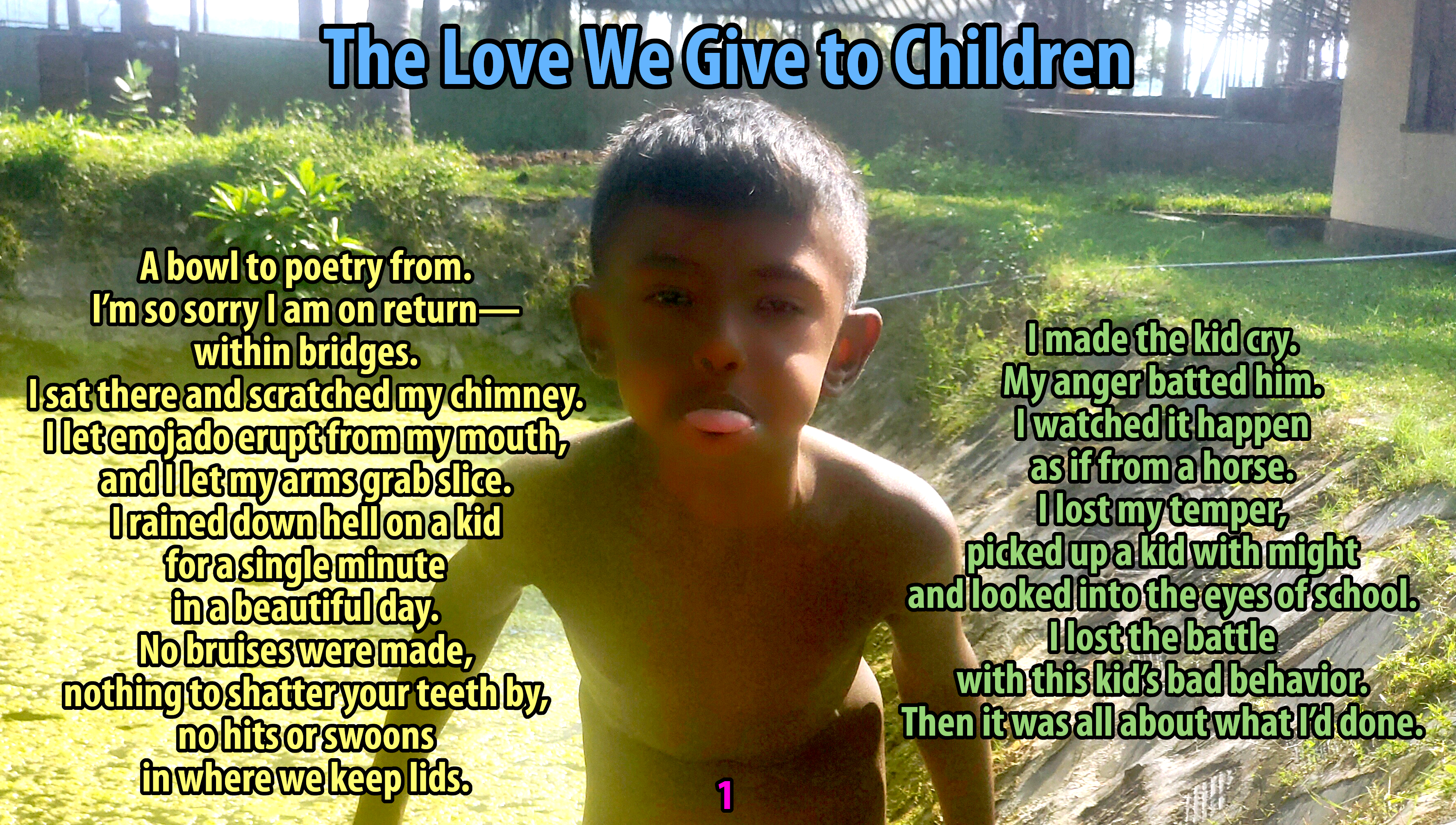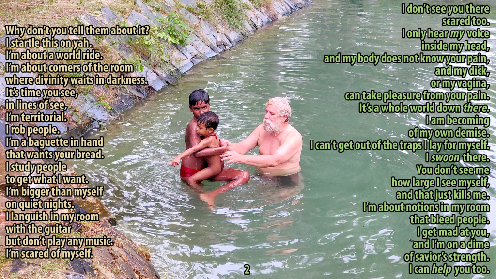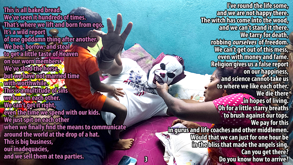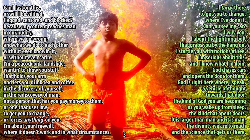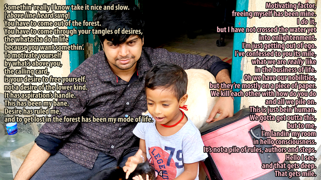 She has not allowed visits, phone calls, or, like I said, anyone to talk to the boy about me. She keeps repeating that she will not allow me to spend one second with Nithish, and here in India, she has that power. Parental rights override the welfare of the child. He has been able to call me in secret to tell me about the abuse he’s received since he was taken and to ask me for help to get him out of there. I have really tried, and today I was finally at court, but only in the parking lot talking to senior advocate who may help. I am a nigger here, and please do not get offended at that word because, although I am not enslaved or beaten, it does describe the level of discrimination I face here in trying to to just talk to my boy. Can you possibly imagine how it feels to not even be able to talk to your child in a photograph, and I was there the night he was born, began parenting him when he was three, have been the main parent since he was seven. The pain of this several previous poems attempt to give some picture of. Imagine how the boy feels. That hurts the most.